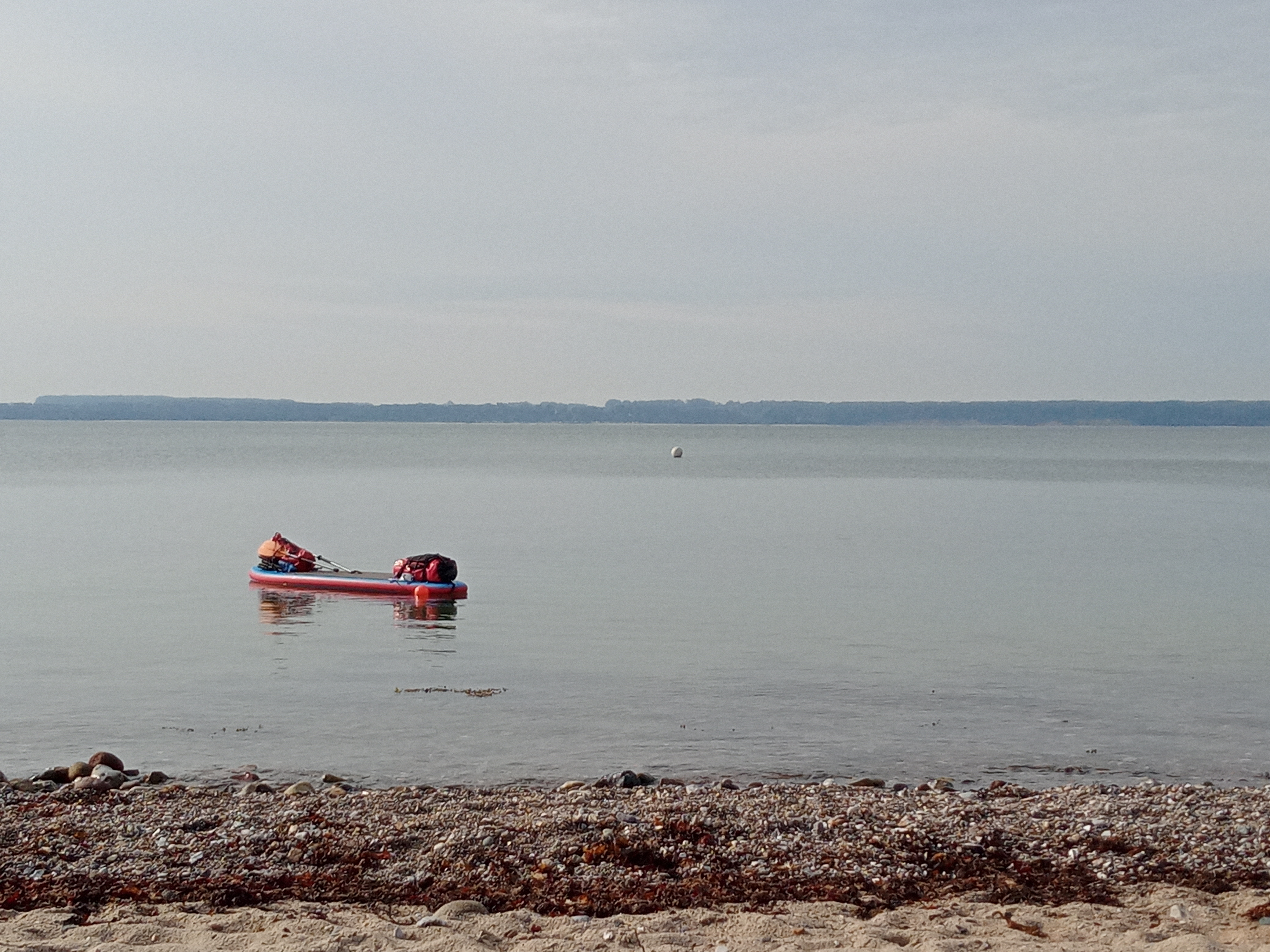 Heute war der Wind mal so, wie ich ihn brauchte – entweder still, ablandig oder Rückenwind. Auf glatter See fuhr ich so vor mich hin, feilte zwischendurch entspannt an meiner Paddeltechnik. Um das Booknis Eck herum bog ich in die Eckernförder Bucht ein. Vorbei an einer schönen Steilküste mit den verschiedensten Vögeln (Austerfischern, Mauerseglern…) ging mein Weg über Langholz. Hier wurden Erinnerungen wach an schöne Klassenfahrten auf dem Reiterhof Juhl, der immer noch existiert und modernisiert wurde 👍. Am Campingplatz Langholz gab es dann den ersten Kaffee für mich heute. Dabei entdeckte ich eine neue Sicherung meines SUPs, da am Strand nur Steine waren 😇. Der kleine Laden, Cafe, Bar auf dem Campingplatz machte einen sehr liebevoll individuell geführten Eindruck; könnte mir vorstellen, hier mal zu übernachten.